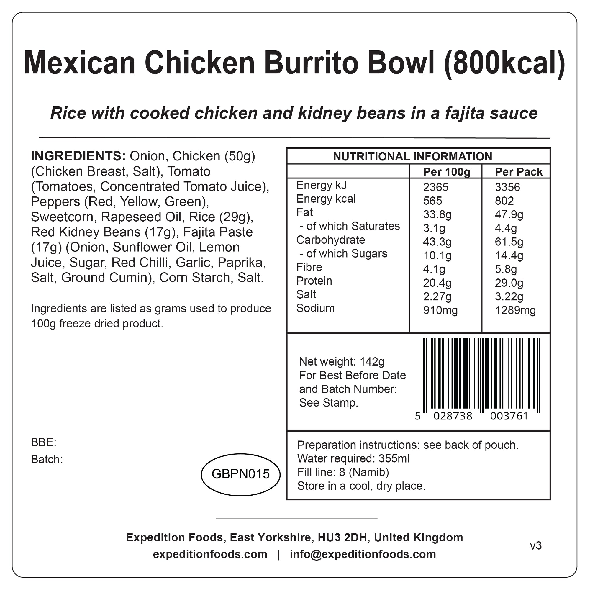INGREDIENTS: Onion, Chicken (50%) (Chicken Breast, Salt), Tomato (Tomato, Concentrated Tomato Juice), Peppers (Red, Yellow, Green), Sweetcorn, Rapeseed Oil, Rice (29%), Red Kidney Beans (17%), Fajita Paste (Onion, Sunflower Oil, Lemon Juice, Sugar, Red Chilli, Garlic, Paprika, Salt, Ground Cumin), Corn Starch, Salt.