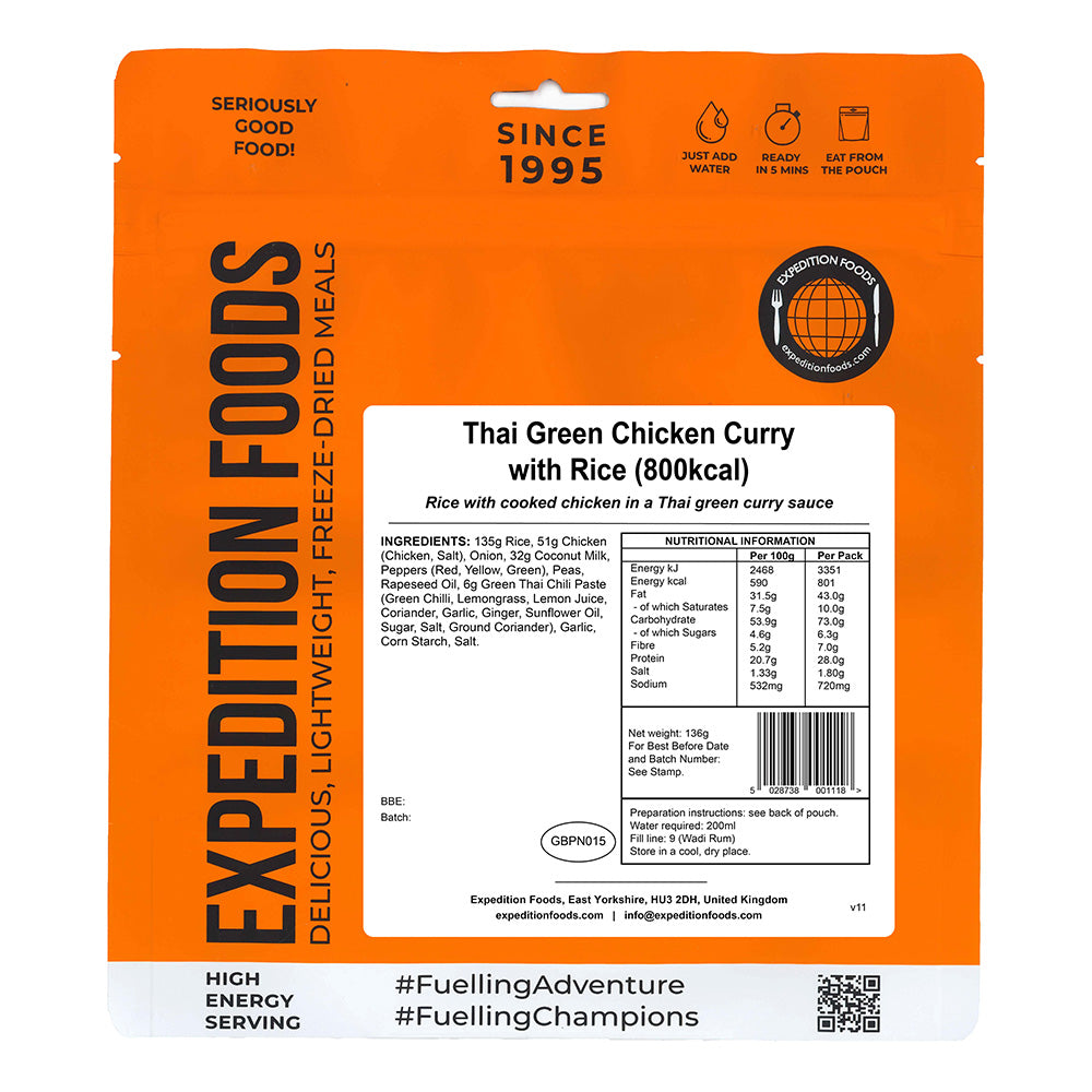 A much-loved Thai dish consisting of tender chicken, fluffy rice, peas, mixed peppers and onions fused with coconut milk, green chilli and lemongrass. This best-selling dish is great at home, on a remote island in the Maldives or anywhere else that takes your fancy...simple to prepare, just add hot water, stir and wait five minutes.